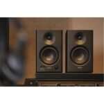 A multifunction control knob on the front of the active speaker allows you to rotate the knob to adjust the volume, long press to power on/off and a short press to switch sound effect mode (monitor or music).