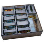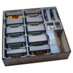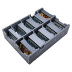 Official insert compatible with Dominion?, with space for 1,100 sleeved or 1,850 unsleeved cards. The design provides both efficient storage and improved game play, with removable token trays for use during the game. The rule books act as a lid on top of the trays.