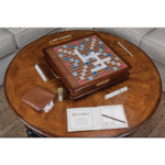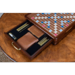 Beautiful wood cabinet with burled veneer panels and decorative metal plaques Rotating faux leather game surface with raised letter grid Drawer with die-cast handle and built-in storage Plated die-cast tile racks & faux ivory Scrabble letter tiles Deluxe faux leather scorebook with gold foil stamping and pencil Faux leather Scrabble tile pouch with drawstring