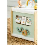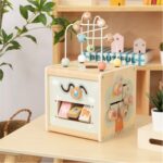 - This wooden activity cube offers five engaging sides of play, each packed with interactive features to spark curiosity and creativity.